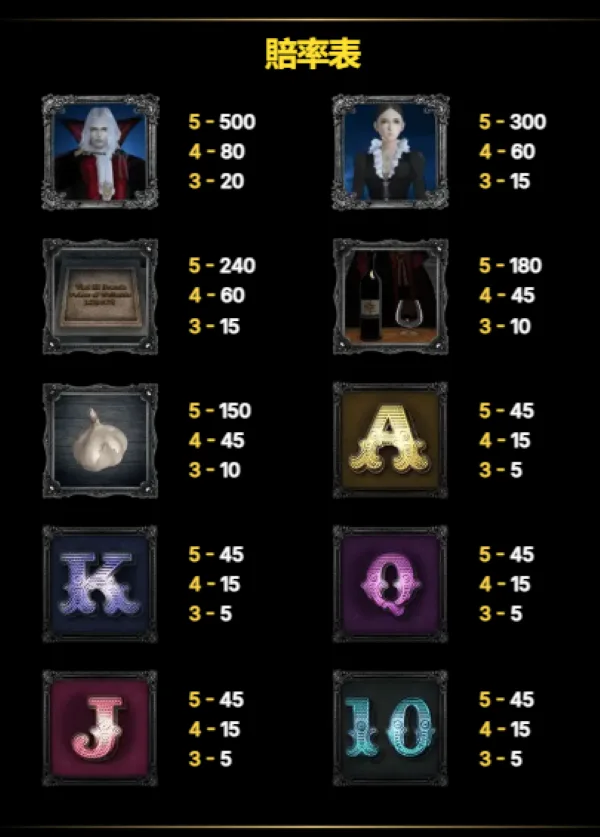 《德古拉》的爆點並不在於高頻小獎,而是明確集中在少數關鍵符號與時機點。從賠率表來看,高價值角色符號的5連線賠付直接拉到數百倍,設計目的並非讓玩家常中,而是用來撐高單次獲利天花板。搭配Wild符號的補線效果,只要盤面稍有條件,高價符號就可能被放大成一次具實質意義的回收,這也是不少玩家感覺「前面平、後面突然跳分」的主要原因。中段道具符號則負責撐住轉輪節奏,避免資金流失過快,整體結構偏向先忍耐、後爆發的高波動配置。