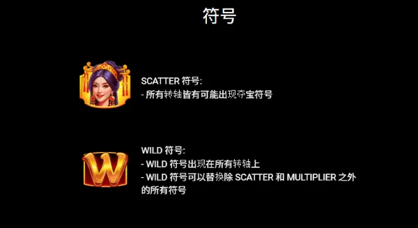 符號設計則融合寶石、金幣與古典樂器等元素,色彩飽和且輪廓立體,使盤面在轉動時依然保持良好的辨識度;金幣符號以發光圓盤形式呈現,中央直接標示乘數數值,視覺上格外醒目,人物與財寶圖示則以金邊與寶石色調強化價值層級。整體美術風格偏向高飽和、明亮且華麗的表現方式,透過金光、寶石色與宮廷服飾的搭配,營造出一種喜氣洋洋、充滿財富寓意的東方奇幻舞台感。