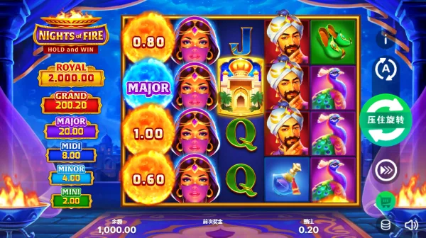 從畫面整體來看,《拉丁夜焰 集鴻運》採用濃烈的異域宮廷風格,視覺主題明顯融合中東與神秘夜市的元素,背景以深藍夜空與宮殿建築輪廓作為基底,搭配火焰、燈火與金色裝飾,營造出一種神秘又華麗的夜晚氛圍。盤面外框採用金色邊框設計,使整個轉軸區域如同舞台般被突顯出來,而兩側燃燒的火盆與藍紫色光影則加強了「火焰之夜」的主題感,使畫面既熱烈又帶有奇幻色彩。