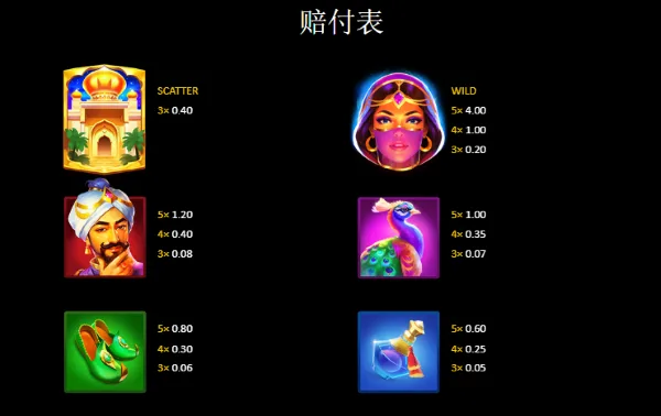 從符號設計來看,本作圖示體系以中東宮廷與異域夜市為主題核心,透過不同角色與物件象徵盤面價值層級,蒙面舞者圖示為WILD符號,其定位為高階替代元素,可補足大部分連線組合並同時提供較高賠付倍率,是盤面中最具延展性的關鍵符號。宮殿門圖示則作為SCATTER,象徵進入神秘寶藏世界的入口,視覺上以金色建築與拱門設計呈現,具有明顯的故事象徵性;角色型符號如宮廷男子與孔雀則屬於中高價值圖示,透過華麗服飾與鮮豔羽毛強化異國風格,同時在賠付層級上高於一般物件符號。