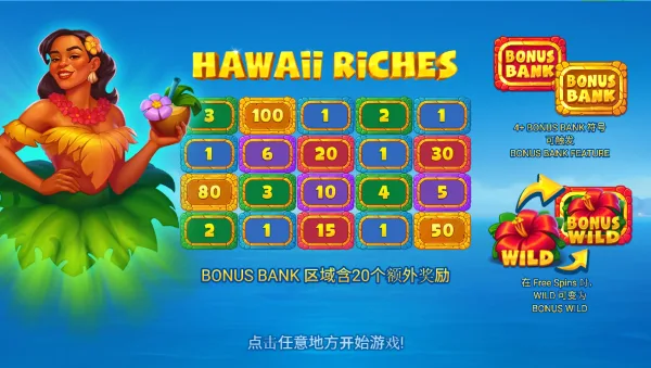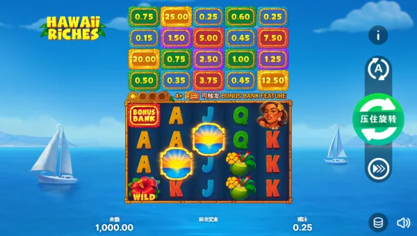 本作以「熱浪海灘」為核心意象,整體美術走向明亮奔放,洋溢濃厚夏威夷風情。盤面設計採5×4輪軸與25條固定賠付線,畫面鋪陳出蔚藍海景與悠然漂流的船影,搭配熱帶水果、野花、貝殼與清涼調酒等符號,營造出如度假般輕鬆愉悅的轉動節奏。玩法結構清晰直觀,強調流暢回合與穩定中獎邏輯,讓玩家在明確判讀組合的同時,也能感受層層堆疊的期待感。