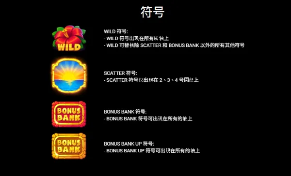 符號設計圍繞夏威夷熱帶意象展開,從功能型圖示到基礎賠付圖示皆具明確角色定位。花朵造型的WILD符號象徵萬用替代元素,視覺以鮮紅花瓣與亮黃字樣強化辨識度,是盤面最具延展性的連線輔助符號;女性角色圖示屬於高階常規符號,賠付倍率高於一般圖示,強化主題故事感與價值層級;木瓜、椰子雞尾酒與貝殼等熱帶物件則屬中階符號,對應穩定輸出結構。整體符號設計透過色彩飽和度與邊框亮度區分價值高低,使玩家在視覺判讀上能迅速辨識圖示權重。