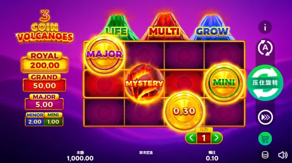 本作的符號設計圍繞「金幣、火焰與火山能量」三大核心概念展開,每一種符號都對應明確的獎金或功能定位。最基礎的Coin符號代表直接獎金價值,其數值區間從0.2倍至4倍總投注不等,而帶有標記的Mini、Minor、Major及更高階的Jackpot符號,則象徵一次性的大額獎勵來源,主要在Bonus Game中出現。Mystery符號則扮演高度不確定性的關鍵角色,結算時才會揭曉實際內容,使盤面在最後階段仍保有反轉空間。