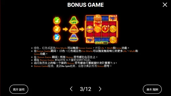 真正體驗轉折點在於Bonus Game期間的符號互動感,火焰標記對應的LIFE、MULTI、GROW不只是數值加減,而是會明確改變盤面狀態,讓獎金成長看得見、算得出來,尤其在MULTI或GROW疊加後,盤面一旦接近填滿,緊張感會明顯上升,因為玩家清楚知道「再來一個關鍵符號,整個結構就會翻倍」。對喜歡觀察盤面變化、享受數值堆疊與臨界點刺激的玩家來說,這是一款耐看、耐玩的火山主題老虎機。