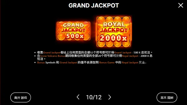 本作以「3座金爆火山」為核心意象,整體美術走向熔岩爆發與能量湧動的強烈視覺風格,盤面以4×3結構呈現,火山、岩漿與能量符號交織出高張力的轉動氛圍。遊戲主軸圍繞火山甦醒與能量累積展開,玩家在旋轉過程中,有機會逐步逼近三座火山的臨界點,並同時挑戰多達五種不同等級的Jackpot;節奏偏向中高速推進,視覺回饋明確,讓每次轉動都帶有「即將引爆」的期待感。